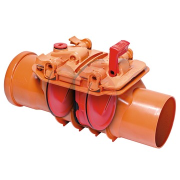 Anvendes som højvandslukker på ledningssystemer til gråt spildevand. Klappen til venstre kan tvangslukkes. Dimension: 110 mm.